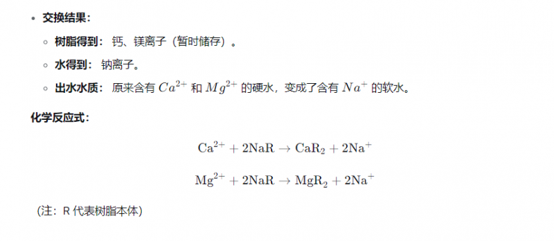 過程:水流經(jīng)樹脂,水中的鈣鎂被吸附,鈉離子釋放到水中。